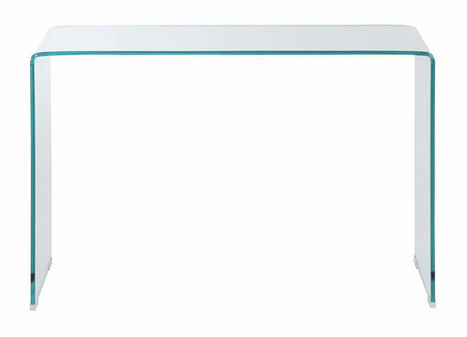 This modern rectangular console table features a clear tempered glass top paired with a geometric base crafted from heavy-gauge metal with a sleek ...