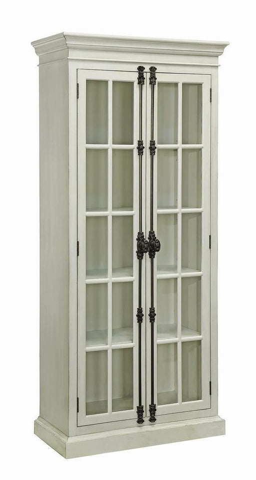 Envision a dining room graced by this tall dining cabinet, a vitrine that radiates charm with its distressed white finish, whispering tales of time...